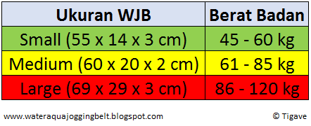 Jadi, agar efektif terapinya, pemilihan ukuran Water Jogging Belt harus disesuaikan dengan berat badan setiap orang. Water Jogging Belt dibuat dengan ukuran S (small/kecil), M (medium/menengah) dan L (large/besar). Perhatikan tabel di bawah ini.